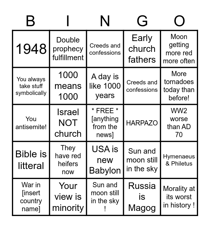 This bingo card has a free space and 27 words: Sun and moon still in the sky, You always take stuff symbolically, Creeds and confessions, Sun and moon still in the sky !, You always take stuff symbolically, Creeds and confessions, Double prophecy fulfillment, Bible is litteral, HARPAZO, Hymenaeus & Philetus, You antisemite!, Early church fathers, War in [insert country name], Your view is minority, More tornadoes today than before!, * FREE * [anything in the news], 1000 means 1000, A day is like 1000 years, They have red heifers now, 1948, WW2 worse than AD 70, Russia is Magog, Israel NOT church, Morality at its worst in history !, USA is new Babylon, Moon getting more red more often and Chinese army.