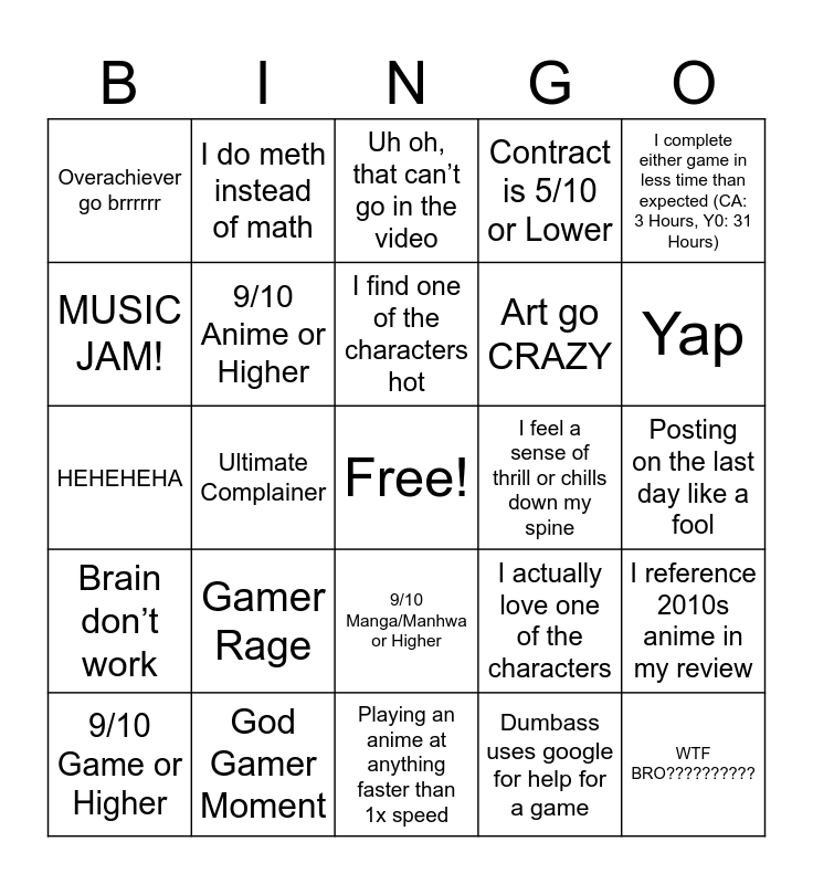 This bingo card has a free space and 24 words: Gamer Rage, God Gamer Moment, I find one of the characters hot, 9/10 Game or Higher, I complete either game in less time than expected (CA: 3 Hours, Y0: 31 Hours), Overachiever go brrrrrr, MUSIC JAM!, I do meth instead of math, I feel a sense of thrill or chills down my spine, 9/10 Manga/Manhwa or Higher, Art go CRAZY, HEHEHEHA, I actually love one of the characters, I reference 2010s anime in my review, 9/10 Anime or Higher, Dumbass uses google for help for a game, Posting on the last day like a fool, Uh oh, that can’t go in the video, Yap, Ultimate Complainer, WTF BRO??????????, Brain don’t work, Contract is 5/10 or Lower and Playing an anime at anything faster than 1x speed.