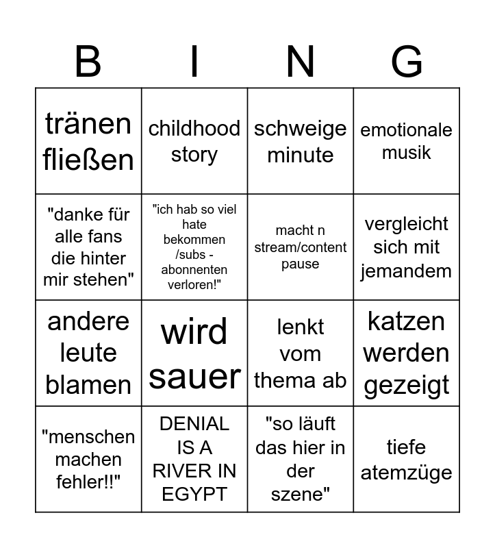 This bingo card has 16 words: DENIAL IS A RIVER IN EGYPT, katzen werden gezeigt, schweige minute, tränen fließen, andere leute blamen, childhood story, lenkt vom thema ab, "so läuft das hier in der szene", "danke für alle fans die hinter mir stehen", "ich hab so viel hate bekommen /subs - abonnenten verloren!", "menschen machen fehler!!", emotionale musik, wird sauer, vergleicht sich mit jemandem, macht n stream/content pause and tiefe atemzüge.
