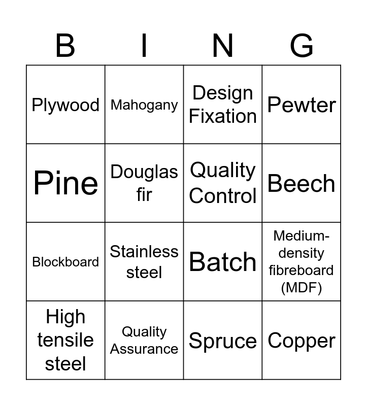 This bingo card has 67 words: Free!, Oak, Walnut, Birch, Ash, Cherry, Mahogany, Maple, Beech, Yew, Cedar, Juniper, Spruce, Pine, Redwood, Douglas fir, Medium-density fibreboard (MDF), Plywood, Chipboard, Blockboard, Aluminium, Copper, Pewter, Silver, Cast iron, Mild steel, Medium carbon steel, High carbon steel, Stainless steel, High speed steel, High tensile steel, Hydro, Solar, Wind, Coal, Oil, Gas, One-off, Batch, Mass, JIT, Quality Control, Quality Assurance, Trees/wood, Recycle, Reduce, Refuse, Rethink, Reuse, Repair, Design Fixation, Collaborative Design, Paint, Varnish, Galvanizing, Lacquer, Beeswax, Polish, Urea Formaldehyde, Melamine Formaldehyde, Epoxy Resin, Acrylic, ABS, Polystyrene, HIPS, Polypropylene and HDPE.