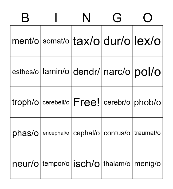 This bingo card has a free space and 39 words: anxi/o, crani/o, gangli/o, lamin/o, neur/o, cephal/o, dendr/, gli/o, lex/o, phas/o, cerebell/o, dur/o, menig/o, phob/o, cerebr/o, encephal/o, iatr/o, ment/o, phren/o, contus/o, esthes/o, isch/o, narc/o, pol/o, poli/o, pont/o, psych/o, radicul/o, schiz/o, somat/o, synaps/o, syncop/o, tax/o, tempor/o, thalam/o, thec/o, traumat/o, troph/o and vertebr/o.