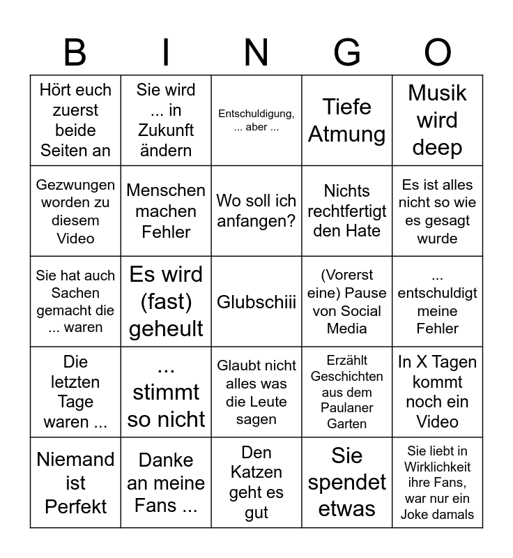 This bingo card has a free space and 24 words: ... stimmt so nicht, Danke an meine Fans ..., Wo soll ich anfangen?, Niemand ist Perfekt, Musik wird deep, Hört euch zuerst beide Seiten an, Gezwungen worden zu diesem Video, Sie wird ... in Zukunft ändern, (Vorerst eine) Pause von Social Media, Glaubt nicht alles was die Leute sagen, Nichts rechtfertigt den Hate, Sie hat auch Sachen gemacht die ... waren, Erzählt Geschichten aus dem Paulaner Garten, In X Tagen kommt noch ein Video, Menschen machen Fehler, Sie spendet etwas, ... entschuldigt meine Fehler, Entschuldigung, ... aber ..., Es ist alles nicht so wie es gesagt wurde, Es wird (fast) geheult, Sie liebt in Wirklichkeit ihre Fans, war nur ein Joke damals, Die letzten Tage waren ..., Tiefe Atmung and Den Katzen geht es gut.