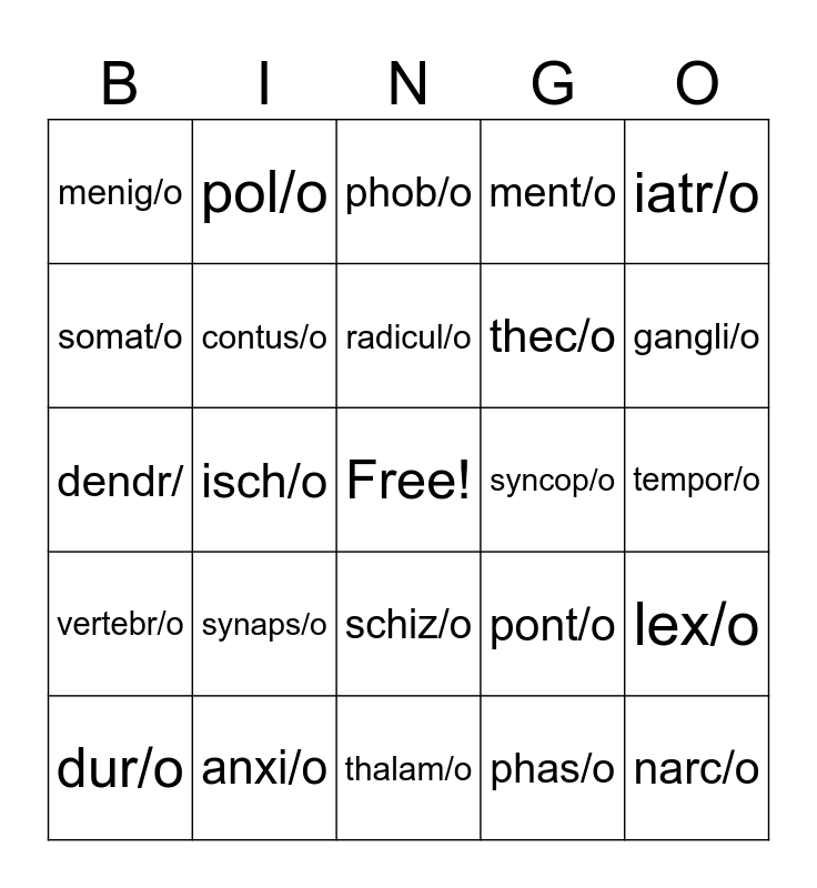 This bingo card has a free space and 39 words: lamin/o, phren/o, cerebr/o, contus/o, dur/o, schiz/o, radicul/o, crani/o, iatr/o, vertebr/o, isch/o, ment/o, narc/o, tempor/o, syncop/o, synaps/o, cerebell/o, menig/o, poli/o, pont/o, somat/o, thalam/o, thec/o, gangli/o, tax/o, esthes/o, neur/o, troph/o, psych/o, pol/o, traumat/o, encephal/o, phob/o, anxi/o, phas/o, cephal/o, lex/o, dendr/ and gli/o.