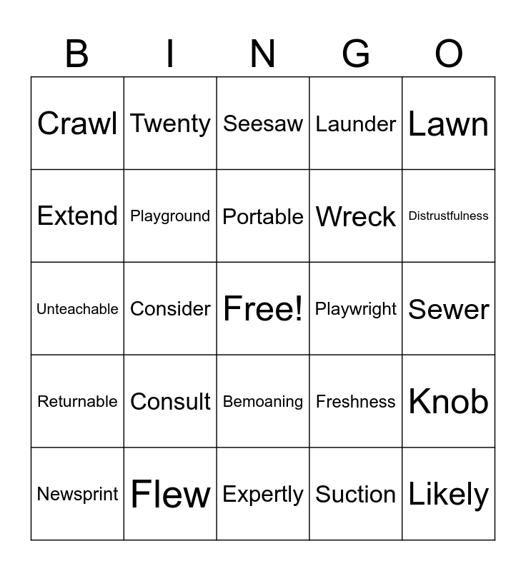 This bingo card has a free space and 396 words: Food, Soon, Feed, Flow, Spoon, Choose, Tooth, Rooster, Broom, Brain, Smooth, Scooter, Moonlight, Cartoon, Toothbrush, Schoolroom, Teaspoon, Shampoo, Raccoon, Afternoon, Unlock, Distrust, Agreeable, Handful, Unchain, Helpful, Teachable, Drinkable, Faithful, Disgusting, Distrustful, Ungrateful, Yawn, Fault, Claw, Haul, Float, Draw, Spool, Crawl, Cool, Lawn, Loan, Cause, Exhaust, Author, Auburn, August, Drawing, Lawn Mower, Lawyer, Igloo, Imperfect, Advertise, Return, Preheat, Madness, Helpless, Refill, Unseen, Prepay, Discard, Endless, Freshness, Portable, Grateful, Returnable, Repayable, Unthinkable, Boastfulness, Unpreventable, Distrustfulness, Applause, Coleslaw, Withdrawn, Sawdust, Drawback, Autumn, Sweepstakes, Wayside, Bridegroom, Entertainment, Pretend, Report, Dismay, Unhurt, Nameless, Likeness, Affordable, Pocketful, Remarkable, Distinctness, Unteachable, Unthankfulness, Pauper, Sawmill, Because, Seesaw, Awesome, Launder, Autoharp, Automatic, Misinterpret, Understood, Predict, Unpack, Disgust, Speechless, Smoothness, Bucketful, Doable, Recording, Preventable, Presentable, Refillable, Boil, Boy, Point, Paint, Roy, Pawn, Joy, Soil, Goose, Coin, Noise, Turmoil, Employ, Enjoy, Destroy, Tinfoil, Boycott, Joyride, Oyster, Appointment, Sharpshooter, Delay, Fraction, Beside, Defrost, Present, Rethink, Action, Mention, Coolness, Toothless, Belonging, Detention, Devotion, Reflection, Soybean, Noiseless, Annoy, Loiter, Exploit, Toyshop, Charcoal, Corduroy, Employee, Employer, Before, Depart, Section, Portion, Redefine, Destruction, Description, Prevention, Ointment, Poison, Convoy, Broiler, Avoid, Embroider, Disappoint, Destroyer, Enjoyment, Decay, Belong, Traction, Suction, Deduction, Bemoaning, Reaction, Unmentionable, New, Grew, Grain, Chew, Stew, News, Fee, Dew, Drawn, Drew, Flew, Jewel, Newsstand, Newscast, Chewable, New York, Newspaper, Screwdriver, Newsletter, Subscribe, Storekeeper, Inspect, Expand, Badly, Windy, Infect, Inflate, Demand, Export, Nightly, Lucky, Likely, Reasonable, Inspection, Exactly, Explainable, Infection, Sewer, Cashew, Unscrew, Mildew, Newborn, Newsreel, Crewneck, Seaplane, Jeweler, Authorize, Bemoan, Intend, Depend, Exclaim, Noisy, Sandy, Brightly, Slowly, Invention, Delightful, Expertly, Prescription, Lewis, Dewdrop, Newsprint, Frustrate, Classmates, Proofread, Inform, Extend, Defeat, Unreal, Snowy, Hardly, Plenty, Darkness, Extinction, Insightful, Prediction, Unhelpful, Out, Round, Cloud, House, Shout, Proud, Blouse, Counter, Thousand, Surround, Countless, Southwest, Doghouse, Outburst, Trousers, Outspoken, Encounter, Consists, Consider, Famous, Tremendous, Nervous, Disastrous, Without, Playground, Madhouse, Outside, Cloudless, Discount, Thundercloud, Underground, Southwestern, Conduct, Confess, Glamorous, Horrendous, Connectable, Outgrew, Dismount, Farmhouse, Account, Boy Scout, Outlaw, Scoutmaster, Outstanding, Counterclockwise, Connect, Contains, Enormous, Contrasting, Knot, Wreck, Quit, Knight, Phone, Knob, Graph, Knife, Wrote, Kneel, Quilt, Wrap, Dolphin, Wrapper, Jackknife, Shipwreck, Knothole, Vanquish, Kneecap, Underline, Handwritten, Complete, Handle, Command, Compose, Consult, Develop, Indeed, Beneath, Simple, Middle, Title, Empty, Rapidly, Completely, Connection, Considerable, Unscramble, Gopher, Knapsack, Quiver, Orphan, Knockout, Banquet, Wrinkle, Emphasis, Equipment, Condense, Convict, Define, Article, Bottle, Riddle, Factory, Correctly, Perfection, Comfortable, Example, Sulphur, Playwright, Unknown, Liquid, Knuckle, Phantom, Writer, Tranquil, Squirrel, Sophomore, Commit, Involve, Explore, Complain, Confine, Become, Readable, Terrible, Safely, Daily, Twenty, Company, Remember, Combustion, Containing and Sphinx.