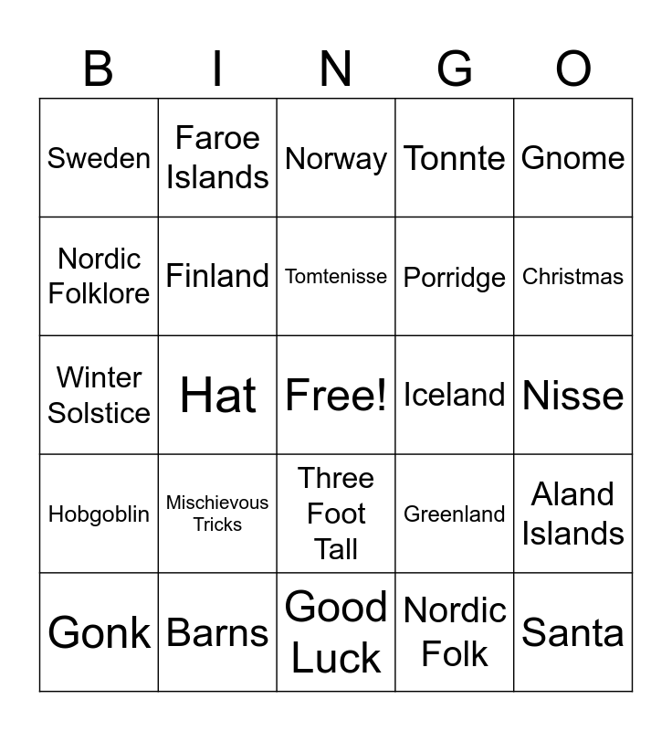 This bingo card has a free space and 29 words: Gonk, Nose, Hat, Beard, Sweden, Norway, Finland, Mischievous Tricks, Iceland, Barns, Nisse, Santa, Good Luck, Nordic Folk, Christmas, Tradition, Three Foot Tall, Hobgoblin, Gnome, Winter Solstice, Greenland, Scandinavia, Porridge, Nordic Folklore, Tonnte, Faroe Islands, Aland Islands, Tomtenisse and Scandinavian Folklore.