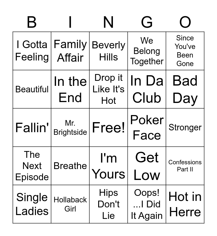 This bingo card has a free space and 55 words: Rehab, Single Ladies, Hey Ya!, I Gotta Feeling, Hips Don't Lie, Lose Yourself, In the End, Crazy in Love, In Da Club, Yeah!, We Belong Together, Cry Me a River, The Way You Move, Toxic, Gold Digger, SOS, Since You've Been Gone, Mr. Brightside, This Love, Hot in Herre, Poker Face, Bye Bye Bye, Get Low, Beverly Hills, A Milli, Drop it Like It's Hot, Oops! ...I Did It Again, The Real Slim Shady, Stronger, Confessions Part II, Best I Ever Had, Foolish, You Belong With Me, You're Beautiful, Beautiful, Fallin', Work It, The Next Episode, Irreplaceable, Low, Family Affair, Jesus Walks, No One, A Thousand Miles, Breathe, Hollaback Girl, Ms. Jackson, U Got It Bad, Day 'N' Nite, Bad Day, Independent Women, Part 1, Before He Cheats, Viva La Vida, I'm Yours and Move B****.