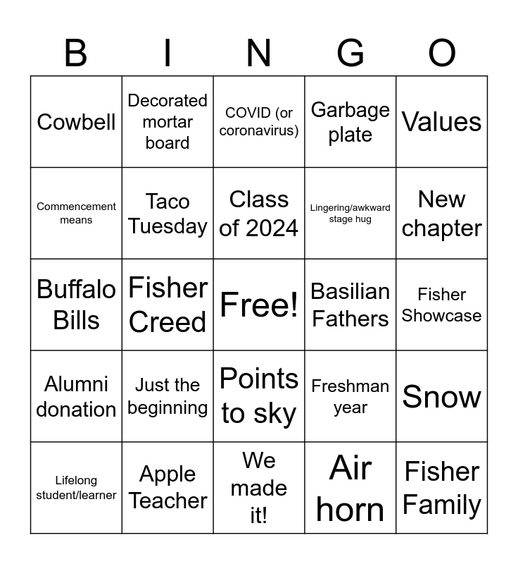This bingo card has a free space and 47 words: Goodness, discipline, knowledge, Fisher Family, Go for it, We made it!, Just the beginning, The dictionary definition, Decorated mortar board, Inspirational quote, Commencement means, Mothers Day, Taco Tuesday, Garbage plate, Snow, Freshman year, Favorite class, Yawning student on Jumbotron, Class of 2024, Basilian Fathers, Took/take a leap, Values, Fisher Creed, Air horn, Cowbell, Lingering/awkward stage hug, Journey, New chapter, Lifelong student/learner, Dance down ramp, Points to sky, Alumni donation, Library renovation, Pursue your dreams, iPad, Fisher Outcomes, AI (artificial intelligence), Apple Teacher, Fisher Showcase, 5-inch stiletto heels, Someone wearing Beaks’ feet, Turkey burger, Zoom, COVID (or coronavirus), Buffalo Bills, Social distancing, Mask, Pandemic and Glory days.