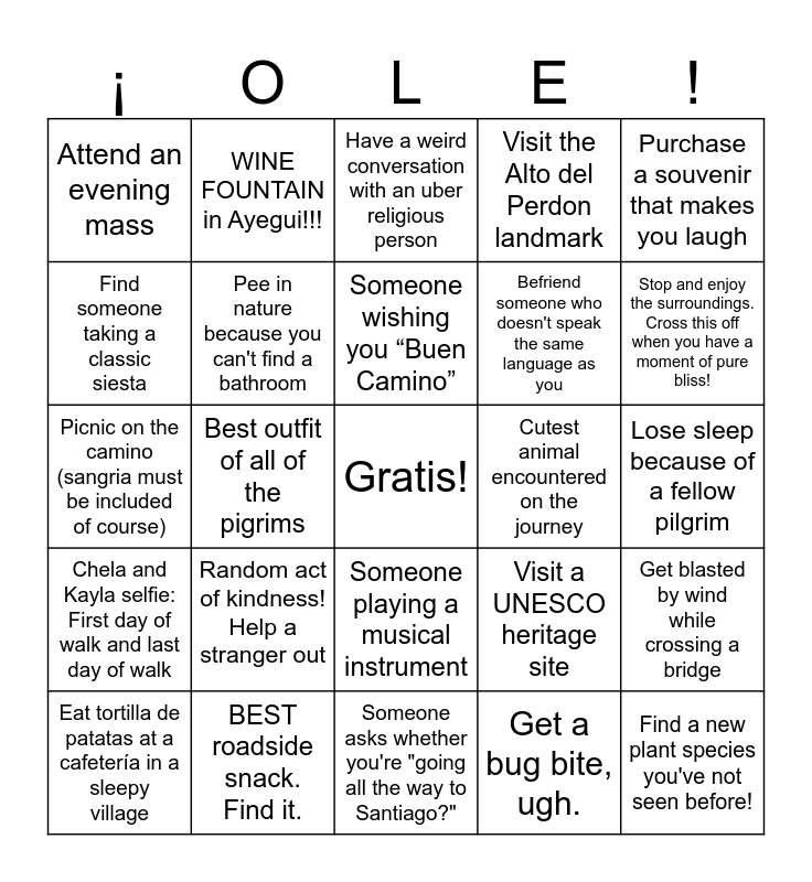 This bingo card has a free space and 24 words: Random act of kindness! Help a stranger out, BEST roadside snack. Find it., Someone wishing you “Buen Camino”, Eat tortilla de patatas at a cafetería in a sleepy village, Purchase a souvenir that makes you laugh, Attend an evening mass, Find someone taking a classic siesta, WINE FOUNTAIN in Ayegui!!!, Cutest animal encountered on the journey, Someone playing a musical instrument, Befriend someone who doesn't speak the same language as you, Picnic on the camino (sangria must be included of course), Visit a UNESCO heritage site, Get blasted by wind while crossing a bridge, Pee in nature because you can't find a bathroom, Get a bug bite, ugh., Lose sleep because of a fellow pilgrim, Have a weird conversation with an uber religious person, Stop and enjoy the surroundings. Cross this off when you have a moment of pure bliss!, Best outfit of all of the pigrims, Find a new plant species you've not seen before!, Chela and Kayla selfie: First day of walk and last day of walk, Visit the Alto del Perdon landmark and Someone asks whether you're "going all the way to Santiago?".