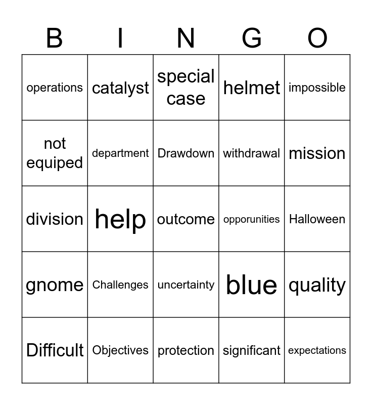 This bingo card has a free space and 24 words: Challenges, Objectives, Drawdown, Difficult, impossible, operations, not equiped, catalyst, opporunities, uncertainty, withdrawal, division, blue, quality, department, significant, Halloween, special case, mission, help, expectations, gnome, helmet and protection.