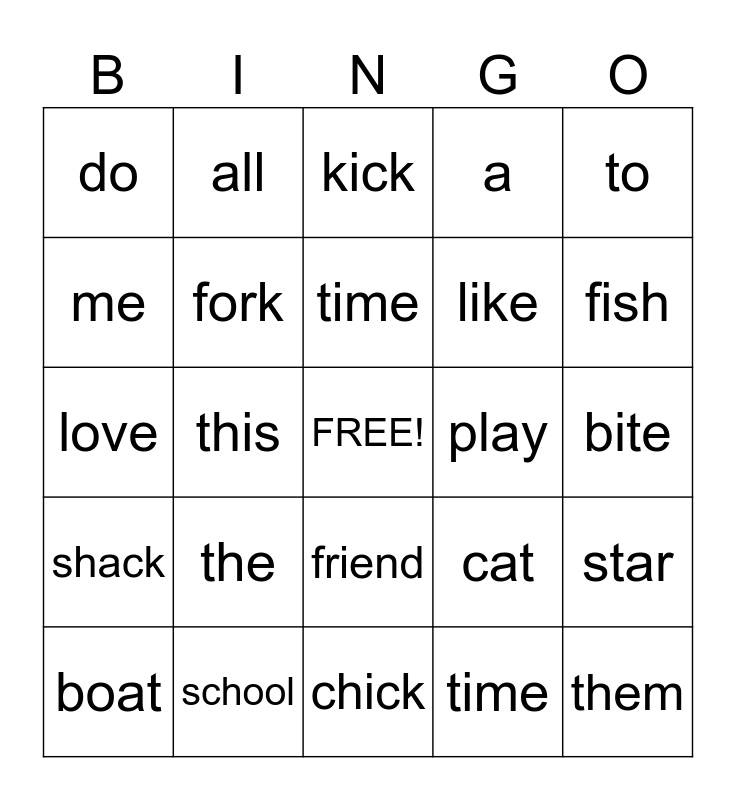 This bingo card has a free space and 24 words: the, school, time, boat, to, do, me, all, play, friend, like, love, cat, star, fork, time, bite, kick, fish, this, them, shack, a and chick.