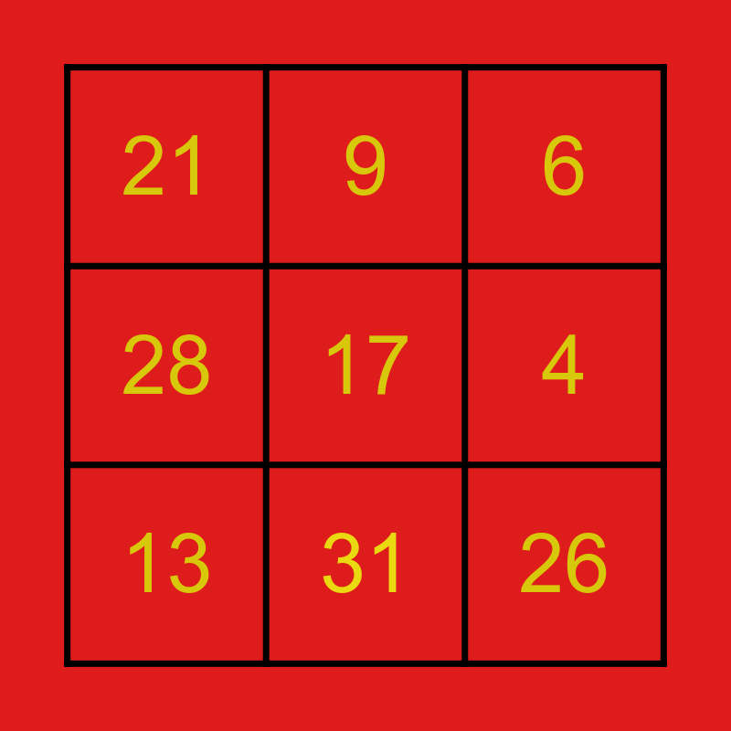 This bingo card has a free space and 8 words: 4, 6, 9, 13, 21, 26, 28 and 31.