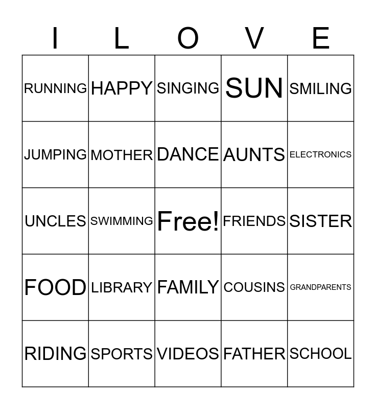 This bingo card has a free space and 24 words: LIBRARY, SPORTS, DANCE, RIDING, SMILING, RUNNING, JUMPING, HAPPY, FRIENDS, FAMILY, AUNTS, UNCLES, COUSINS, GRANDPARENTS, MOTHER, FATHER, SISTER, SINGING, ELECTRONICS, SWIMMING, SCHOOL, FOOD, SUN and VIDEOS.