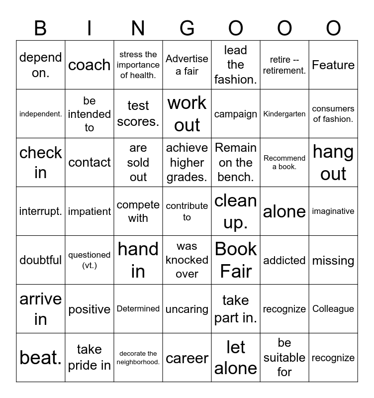 This bingo card has 50 words: Colleague, Kindergarten, be suitable for, impatient, are sold out, was knocked over, coach, career, retire -- retirement., Book Fair, Feature, Advertise a fair, Recommend a book., Remain on the bench., Determined, imaginative, independent., consumers of fashion., beat., lead the fashion., campaign, compete with, depend on., be intended to, take pride in, contribute to, test scores., decorate the neighborhood., stress the importance of health., achieve higher grades., feel proud of., doubtful, positive, uncaring, interrupt., alone, addicted, missing, arrive in, check in, hand in, take part in., questioned (vt.), let alone, hang out, work out, clean up., recognize, contact and recognize.