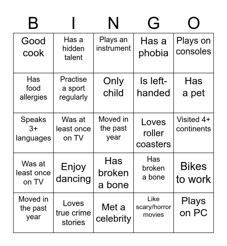⚠ This card has duplicate items: Like scary/horror movies (2), Plays an instrument (3), Good cook (2), Bikes to work (2), Married or once married (2), Has a pet (2), Enjoy dancing (2), Can bake (2), Was at least once on TV (2), Moved in the past year (2), Plays on consoles (3), Has a hidden talent (2), Has a phobia (2), Met a celebrity (2)