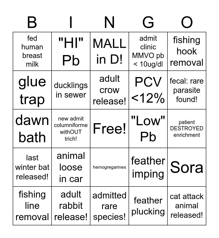 This bingo card has a free space and 24 words: animal loose in car, adult rabbit release!, adult crow release!, fishing line removal, fishing hook removal, fed human breast milk, glue trap, "HI" Pb, "Low" Pb, hemogregarines, PCV <12%, dawn bath, feather imping, Sora, ducklings in sewer, feather plucking, patient DESTROYED enrichment, MALL in D!, fecal: rare parasite found!, new admit columniforme withOUT trich!, cat attack animal released!, last winter bat released!, admit clinic MMVO pb < 10ug/dl and admitted rare species!.