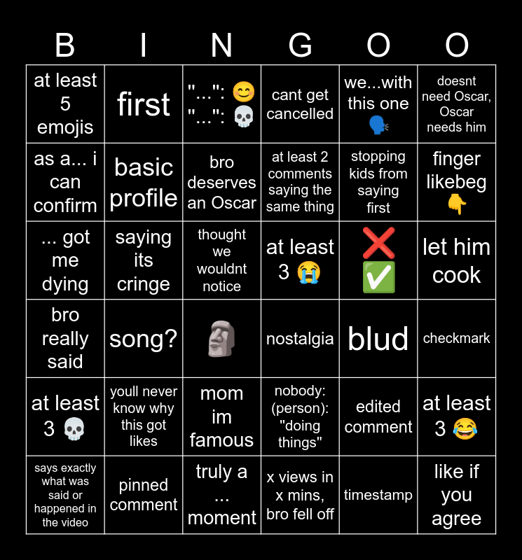 This bingo card has 36 words: nobody: (person): ''doing things'', mom im famous, x views in x mins, bro fell off, as a... i can confirm, bro really said, at least 3 π, basic profile, truly a ... moment, we...with this oneπ£, edited comment, finger likebegπ, cant get cancelled, at least 3 π, saying its cringe, at least 2 comments saying the same thing, at least 5 emojis, at least 3 π, β β , ... got me dying, ''...'': π ''...'': π, thought we wouldnt notice, song?, nostalgia, πΏ, blud, first, stopping kids from saying first, pinned comment, bro deserves an Oscar, doesnt need Oscar, Oscar needs him, like if you agree, says exactly what was said or happened in the video, checkmark, let him cook, youll never know why this got likes and timestamp.