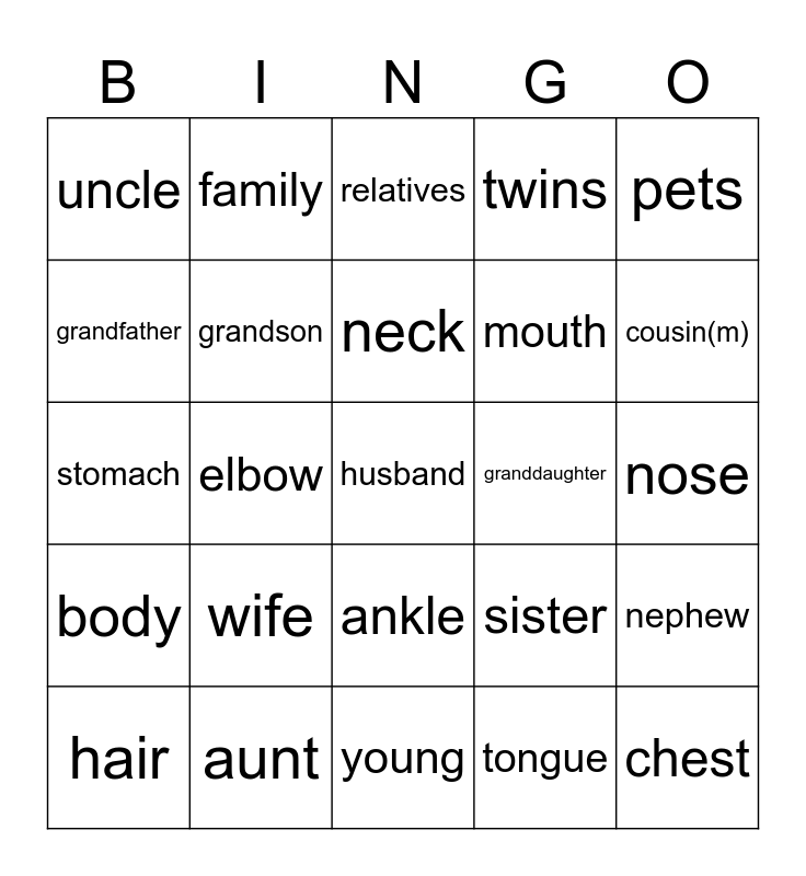 This bingo card has a free space and 48 words: Free!, aunt, brother, cousin (f), cousin(m), daughter, family, father, granddaughter, grandmother, grandfather, grandson, mother, nephew, niece, old, relatives, sister, son, uncle, wife, young, twins, pets, eye, elbow, neck, leg, nose, body, cheeks, arm, hand, forehead, hair, finger, toe, tongue, chest, back, knee, ankle, mouth, teeth, stomach, ear, skin and bone.