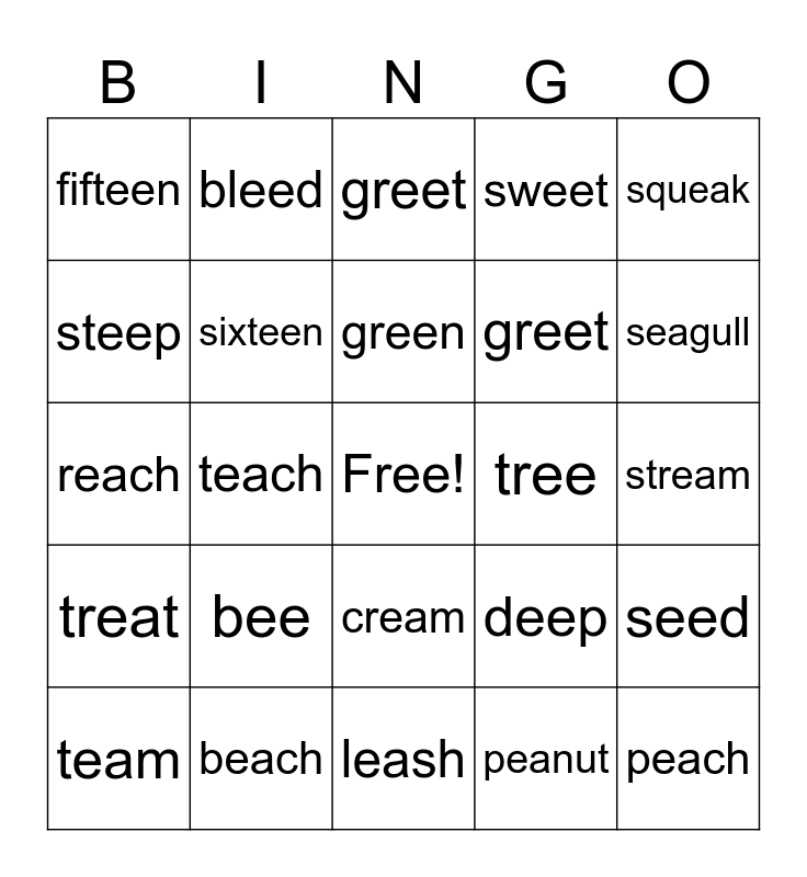This bingo card has a free space and 29 words: team, mean, teach, queen, fifteen, greet, sixteen, bee, tree, beach, stream, peach, leash, peanut, seagull, sneak, cream, treat, squeak, reach, deep, fleet, greet, steep, sweet, bleed, seed, green and sheep.