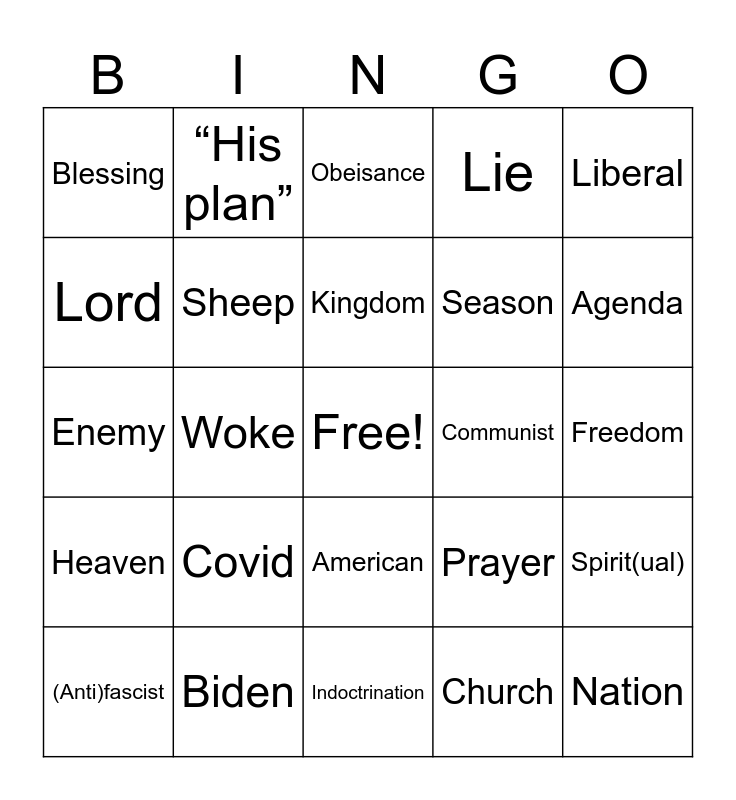 This bingo card has a free space and 29 words: Powers-that-be, Biden, Obeisance, Exposing, Liberal, Blessing, Sheep, Kingdom, Communist, Spirit(ual), (Anti)fascist, Woke, Church, Nation, Enemy, Obama, Indoctrination, Prayer, Agenda, Heaven, Covid, Trump, Season, Freedom, Lord, “His plan”, American, Lie and Snowflake.