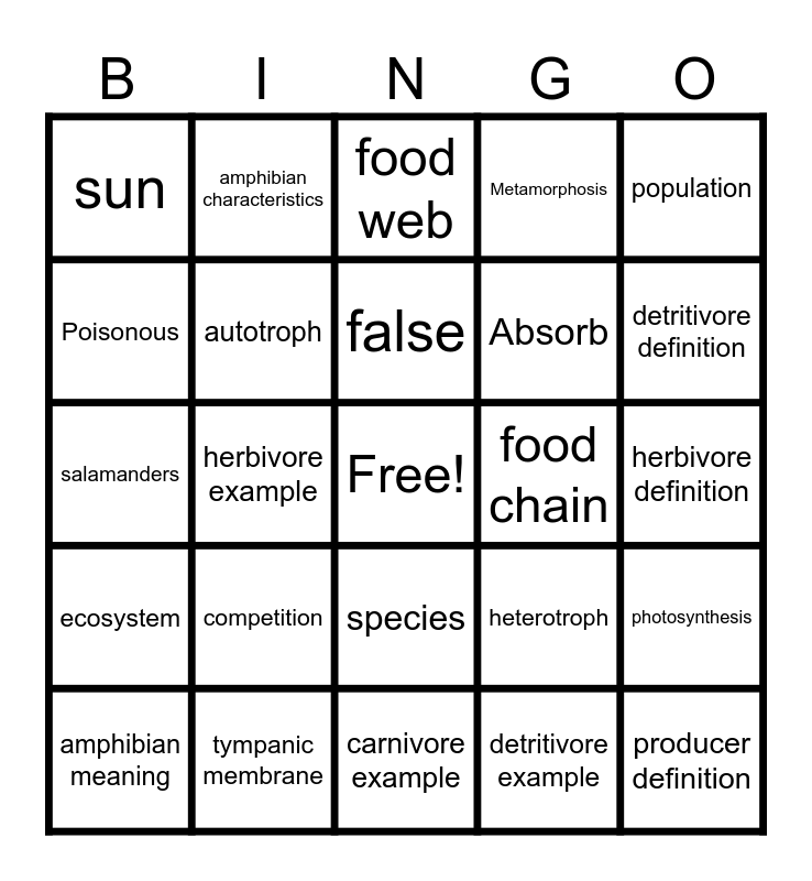 This bingo card has a free space and 31 words: carnivore example, omnivore example, herbivore example, plant example, sun, food web, autotroph, heterotroph, food chain, detritivore example, herbivore definition, producer definition, apex predator, omnivore definition, detritivore definition, carnivore definition, photosynthesis, competition, ecosystem, species, population, energy pyramid, amphibian meaning, amphibian characteristics, Absorb, Poisonous, Metamorphosis, salamanders, tympanic membrane, false and true.