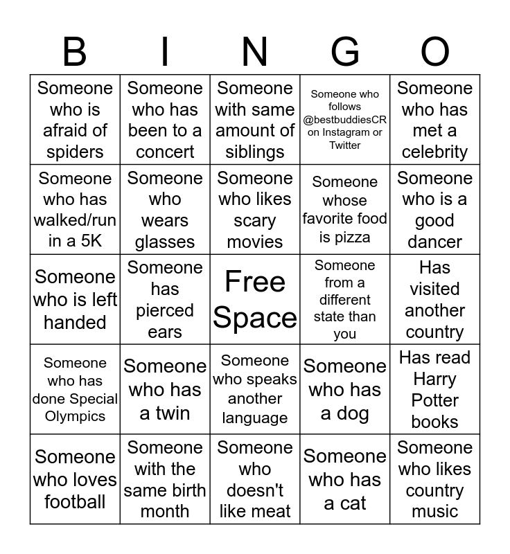 This bingo card has a free space and 24 words: Someone who has a twin, Someone with the same birth month, Someone who likes scary movies, Someone who loves football, Someone who has met a celebrity, Someone who is afraid of spiders, Someone who has walked/run in a 5K, Someone who has been to a concert, Someone from a different state than you, Someone who speaks another language, Someone whose favorite food is pizza, Someone who is left handed, Someone who has a dog, Has read Harry Potter books, Someone who wears glasses, Someone who has a cat, Has visited another country, Someone with same amount of siblings, Someone who is a good dancer, Someone has pierced ears, Someone who likes country music, Someone who has done Special Olympics, Someone who follows @bestbuddiesCR on Instagram or Twitter and Someone who doesn't like meat.
