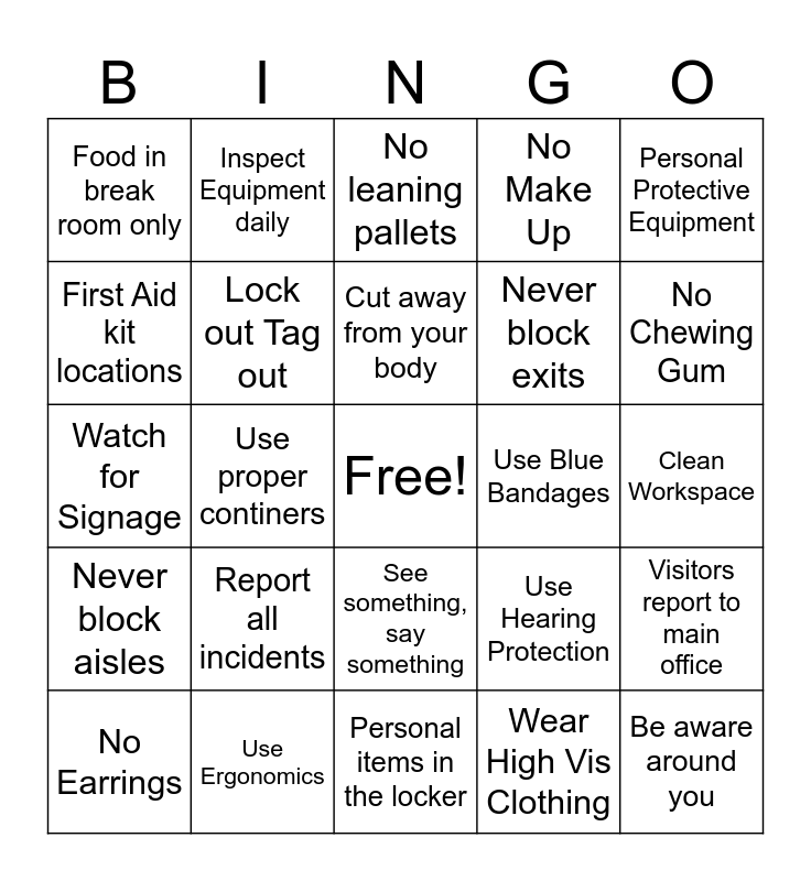 This bingo card has a free space and 24 words: No Earrings, Report all incidents, Cut away from your body, Wear High Vis Clothing, Personal Protective Equipment, Food in break room only, Inspect Equipment daily, No leaning pallets, Use Blue Bandages, Clean Workspace, Watch for Signage, Lock out Tag out, Use Hearing Protection, Visitors report to main office, First Aid kit locations, Use Ergonomics, Personal items in the locker, No Make Up, No Chewing Gum, Never block aisles, Use proper continers, See something, say something, Never block exits and Be aware around you.