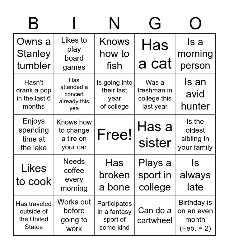 This bingo card has a free space and 25 words: Needs coffee every morning, Participates in a fantasy sport of some kind, Is going into their last year of college, Has traveled outside of the United States, Is a morning person, Owns a Stanley tumbler, Hasn’t drank a pop in the last 6 months, Likes to play board games, Has a sister, Has broken a bone, Was a freshman in college this last year, Enjoys spending time at the lake, Plays a sport in college, Is always late, Has attended a concert already this yea, Likes pineapple on pizza, Is the oldest sibling in your family, Knows how to fish, Is an avid hunter, Knows how to change a tire on your car, Birthday is on an even month (Feb. = 2), Works out before going to work, Likes to cook, Has a cat and Can do a cartwheel.