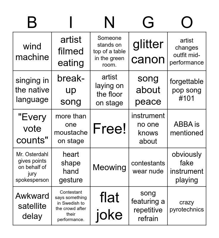 This bingo card has a free space and 50 words: winking at camera, crazy pyrotechnics, pride flag, flat joke, heart shape hand gesture, flag waving, artist filmed eating, backing dancer falls over, singing in the native language, a song features more than 3 languages, break-up song, glitter canon, obviously fake instrument playing, contestants wear nude, a kiss on stage, contestant engaging the crowd to sing along, artist laying on the floor on stage, instrument no one knows about, sticking the tongue out to the camera, artist changes outfit mid-performance, more than one moustache on stage, song featuring a repetitive refrain, wind machine, song about peace, fire on the stage, traditional costume, forgettable pop song #101, a delegation surprised / caught unaware on the camera shot from the green room, Someone stands on top of a table in the green room., Meowing, Big shoulders/sleeves, cringe host moment, host costume change, the hosts perform on stage, Contestant says something in Swedish to the crowd after their performance., host gets the name of a country or artist wrong, dancing around israel war, russia is mentioned, A contestant makes a political statement., ABBA is mentioned, loreen sings both tattoo and euphoria, Love Love Peace Peace reference, blatant political voting, Overenthusiastic score delivery, Awkward satellite delay, "Every vote counts", Spokesperson sings and does a monologue before presenting points, Cyprus and Greece trade 12 points, Mr. Osterdahl gives points on behalf of jury spokesperson and A country not on the continent of Europe gets into the top 5.