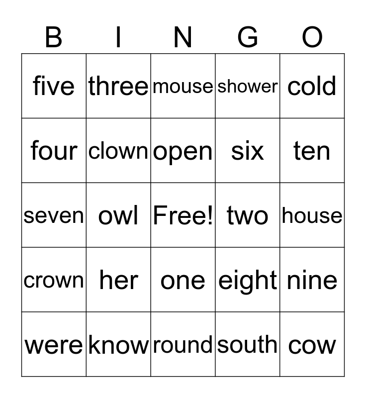 This bingo card has a free space and 24 words: her, know, open, were, cold, five, four, three, two, one, six, seven, eight, nine, clown, south, house, mouse, ten, owl, cow, crown, shower and round.