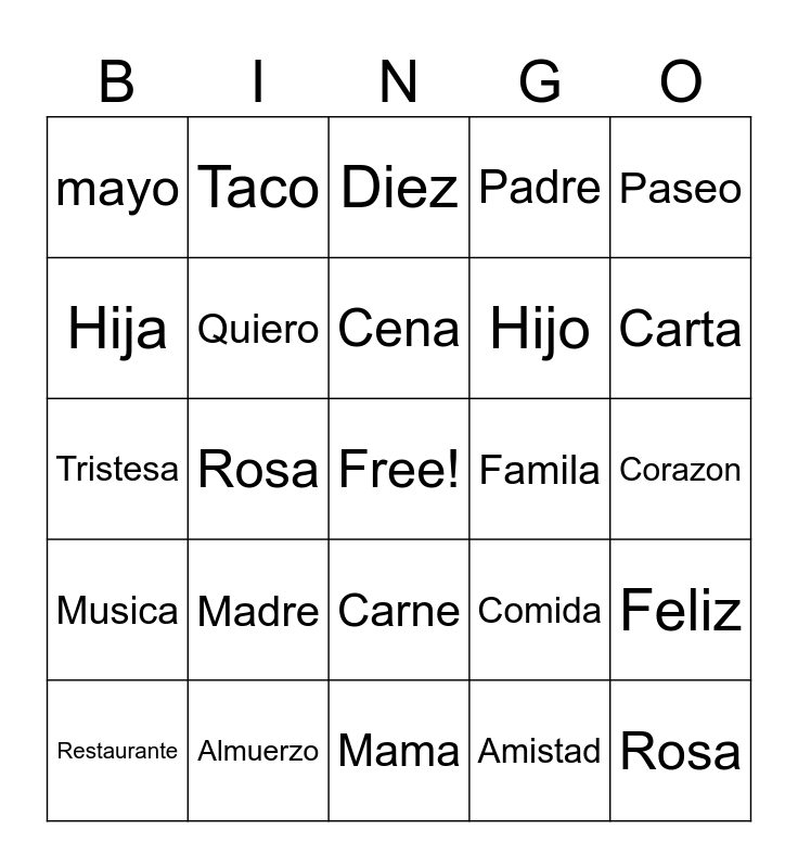 This bingo card has a free space and 31 words: Mama, Amor, Rosa, Dia, mayo, Diez, Quiero, Comida, Famila, Amistad, Corazon, Rosa, Rojo, Regalo, Carta, Flor, Feliz, Madre, Musica, Carne, Paseo, Parque, Restaurante, Taco, Hijo, Hija, Padre, Tristesa, Almuerzo, Cena and Desayuno.