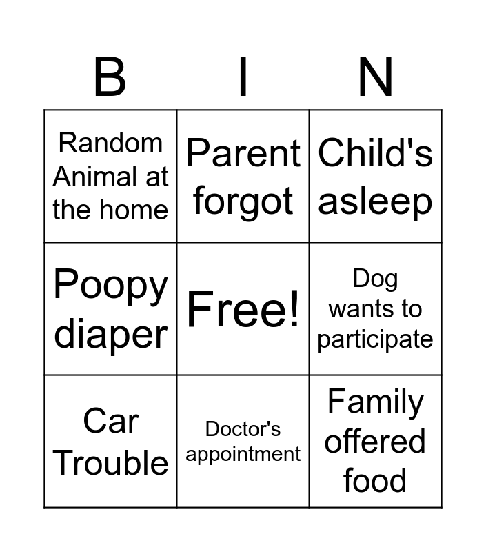 This bingo card has a free space and 8 words: Dog wants to participate, Child's asleep, Parent forgot, Car Trouble, Random Animal at the home, Family offered food, Poopy diaper and Doctor's appointment.