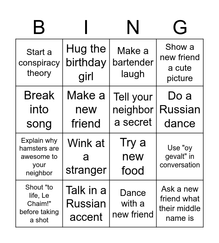 This bingo card has 24 words: Publicly compliment Leeza's dad, Hug a stranger, Do a Russian dance, Make a toast, Break into song, Start a conspiracy theory, Make a new friend, Hug the birthday girl, Talk in a Russian accent, Get someone to compliment your hair, Explain why hamsters are awesome to your neighbor, Try a new food, Compliment a waiter, High five a gypsy dancer, Tell your neighbor a secret, Chug a glass of water, Dance with a new friend, Make a bartender laugh, Wink at a stranger, Use "oy gevalt" in conversation, Shout "to life, Le Chaim!" before taking a shot, Ask a new friend what their middle name is, Show a new friend a cute picture and Blow a kiss at a new friend.