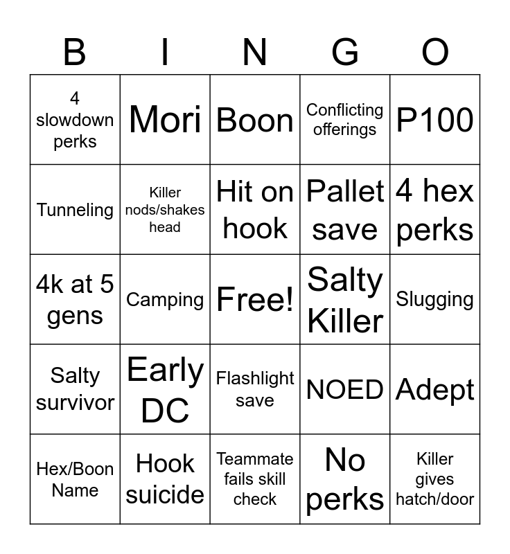 This bingo card has a free space and 24 words: Early DC, Hook suicide, Hit on hook, Hex/Boon Name, P100, 4 slowdown perks, Tunneling, Mori, Salty Killer, Flashlight save, Pallet save, 4k at 5 gens, NOED, Adept, Killer nods/shakes head, No perks, Slugging, Boon, 4 hex perks, Camping, Killer gives hatch/door, Salty survivor, Conflicting offerings and Teammate fails skill check.