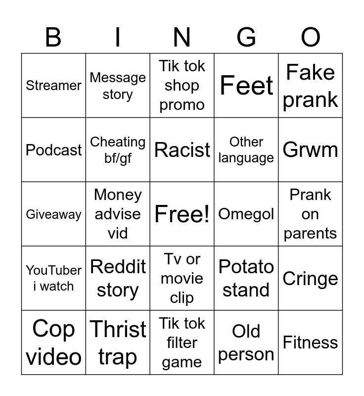 This bingo card has a free space and 24 words: Reddit story, Thrist trap, Racist, Cop video, Fake prank, Streamer, Podcast, Message story, Omegol, Tv or movie clip, Other language, Giveaway, Potato stand, Cringe, Cheating bf/gf, Old person, Prank on parents, Tik tok shop promo, Grwm, Money advise vid, Fitness, YouTuber i watch, Feet and Tik tok filter game.