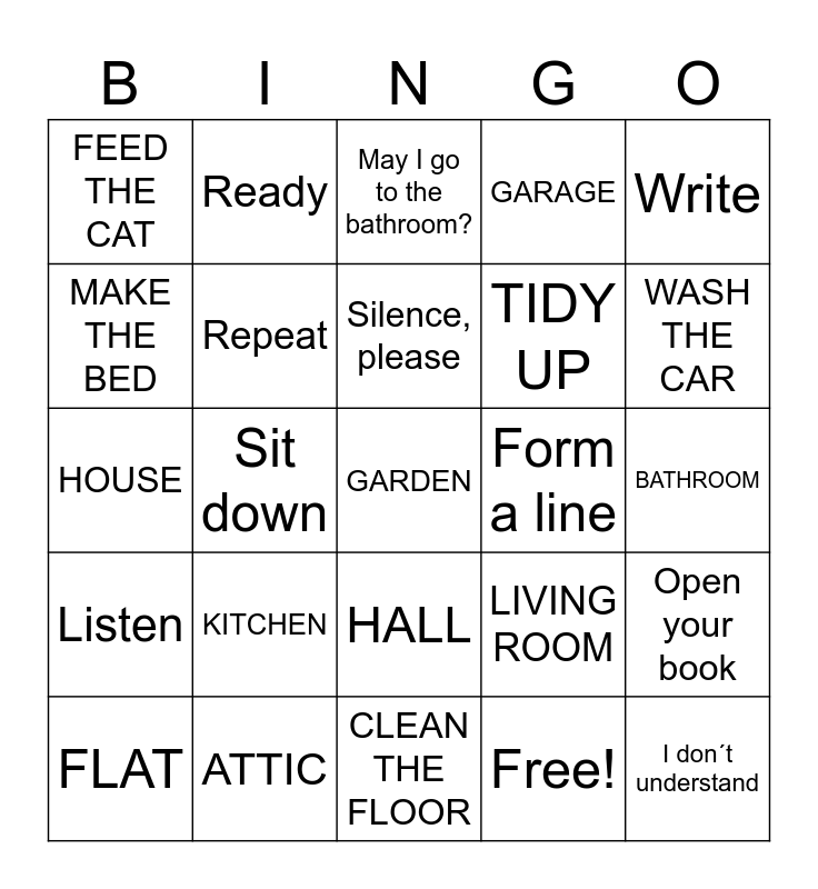 This bingo card has 32 words: Free!, Raise your hand, Sit down, Look, Listen, Repeat, Write, Open your book, Ready, I don´t understand, Silence, please, May I go to the bathroom?, Close your book, Put your things away, Form a line, No running, FLAT, HOUSE, HALL, KITCHEN, LIVING ROOM, BEDROOM, BATHROOM, ATTIC, GARDEN, GARAGE, TIDY UP, MAKE THE BED, FEED THE CAT, CLEAN THE FLOOR, LAY THE TABLE and WASH THE CAR.