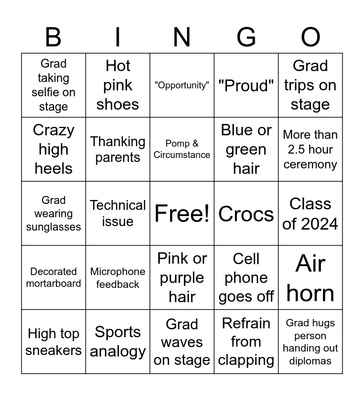 This bingo card has a free space and 24 words: Microphone feedback, Sports analogy, Pomp & Circumstance, High top sneakers, Grad trips on stage, Grad taking selfie on stage, Crazy high heels, Hot pink shoes, Crocs, Pink or purple hair, Blue or green hair, Grad wearing sunglasses, Cell phone goes off, Air horn, Thanking parents, Refrain from clapping, Class of 2024, "Opportunity", More than 2.5 hour ceremony, Technical issue, Grad hugs person handing out diplomas, Decorated mortarboard, "Proud" and Grad waves on stage.