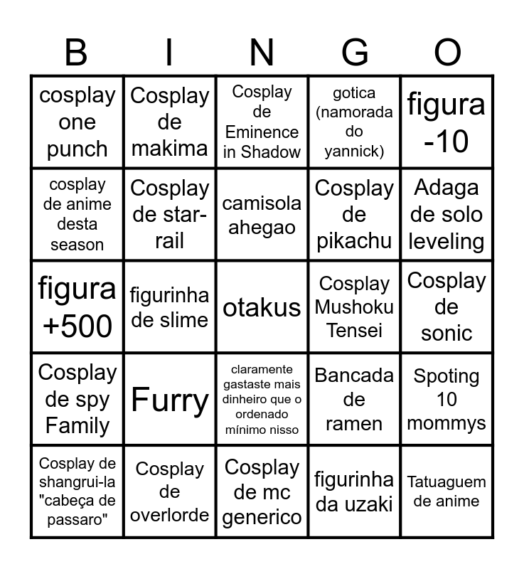 This bingo card has a free space and 35 words: Cosplay de Genshin, Placa de Free Hugs, cosplay de ash, Cosplay de star-rail, claramente gastaste mais dinheiro que o ordenado mínimo nisso, gotica (namorada do yannick), cosplay de anime desta season, Cosplay de lol, camisola ahegao, Cosplay de jujutsu, figura +500, figura -10, fugurinha de dragon maid, Jogo do mario na nintendo, cosplay one punch, Cosplay Mushoku Tensei, figurinha da uzaki, figurinha de slime, Cosplay de spy Family, Tatuaguem de anime, Bancada de ramen, Cosplay de shangrui-la "cabeça de passaro", Spoting 10 mommys, Cosplay de overlorde, Cosplay de Eminence in Shadow, Adaga de solo leveling, espada do 7ds "meliodas", katana da shinobu, Cosplay de pikachu, Cosplay de sonic, Coplay de haikyu mas sem ser da main team, Cosplay de mc generico, Furry, Cosplay de makima and Cosplay de homen aranha.