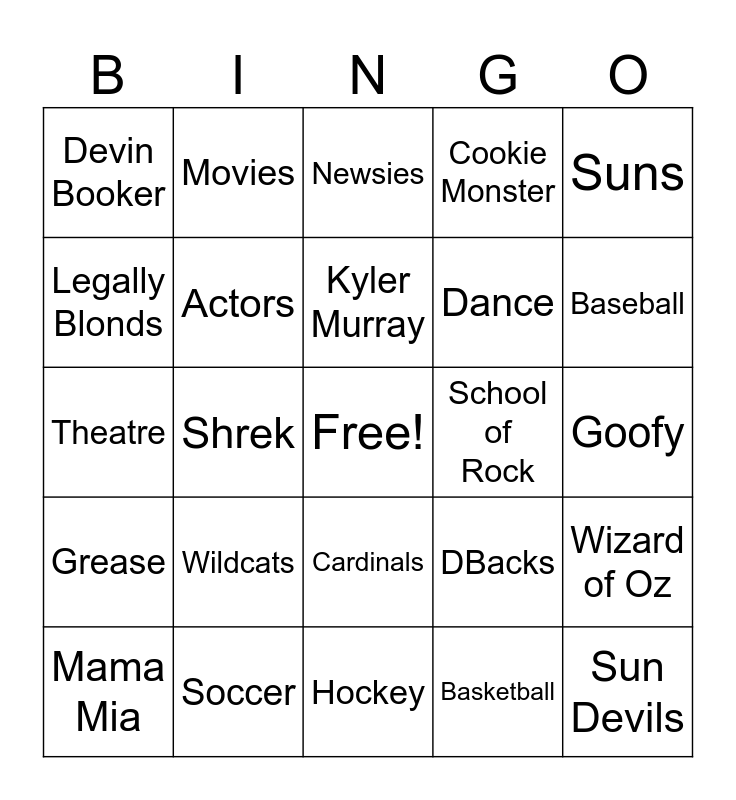 This bingo card has a free space and 29 words: Mama Mia, Once Upon a Mattress, Shrek, Football, Devin Booker, Newsies, Actors, Wildcats, School of Rock, Soccer, Goofy, Sun Devils, Hockey, Basketball, Baseball, Jester, Cardinals, Grease, Suns, Theatre, DBacks, Lion King, Dance, Legally Blonds, Cookie Monster, Movies, Wizard of Oz, Kyler Murray and Sing.