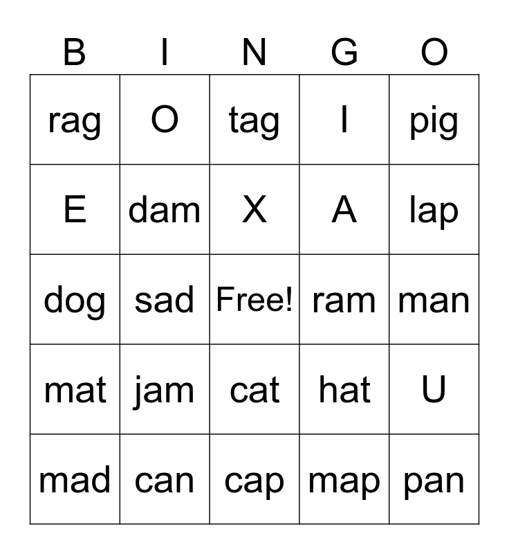 This bingo card has a free space and 29 words: mad, dad, sad, bag, rag, tag, dam, jam, ram, can, man, pan, cap, map, lap, bat, cat, mat, pig, dog, hat, pen, A, E, I, O, U, X and Z.