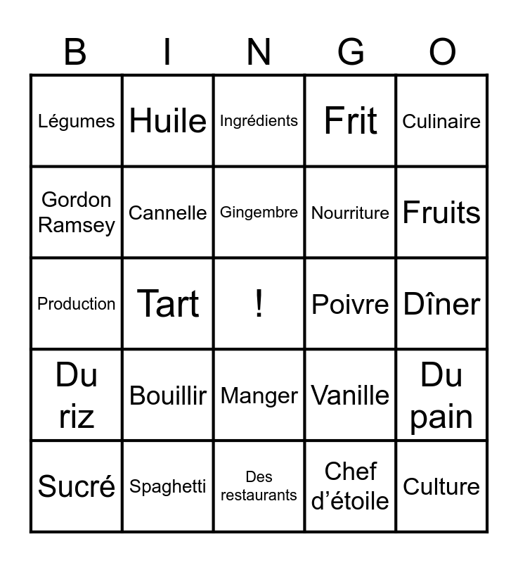 This bingo card has a free space and 24 words: Bouillir, Spaghetti, Gingembre, Sucré, Culinaire, Légumes, Gordon Ramsey, Huile, Poivre, Manger, Nourriture, Production, Vanille, Du pain, Cannelle, Chef d’étoile, Dîner, Ingrédients, Fruits, Tart, Culture, Du riz, Frit and Des restaurants.