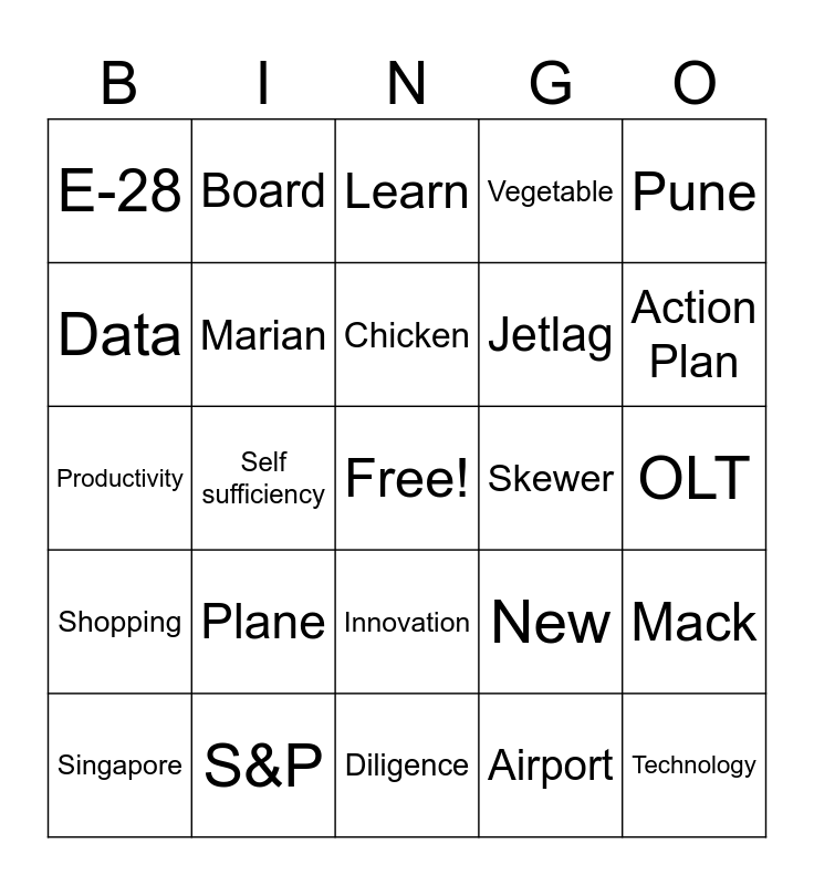 This bingo card has a free space and 73 words: Free!, Strategy, E-28, AI, Encryption, Food, Shopping, Project, New, Thank you, Kate, Tim, Marian, OLT, ELT, Board, Diligence, Data, Samosa, Skewer, Chicken, Vegetable, Pune, Bangalore, Singapore, State Street, Eagle, BNY Melon, JP Morgan, Factset, S&P, Gen AI, Efficiencies, Voice of Client, Self sufficiency, Outsources Services, Red Flags, Data, Technology, Hangzhou, Airport, Plane, Hotel, Rickshaw, Course, Jetlag, Learn, Eat, Velocity, Productivity, Automation, Pilot, Sand-boxing, RFP, Performance, Modernise, Challenges, Innovation, Leverage, Ingest, Feedback, Tactical, Model, Action Plan, Cadence, SMEs, Keli, Ross, Mack, Recognition, Values, Impact and Spring roll.