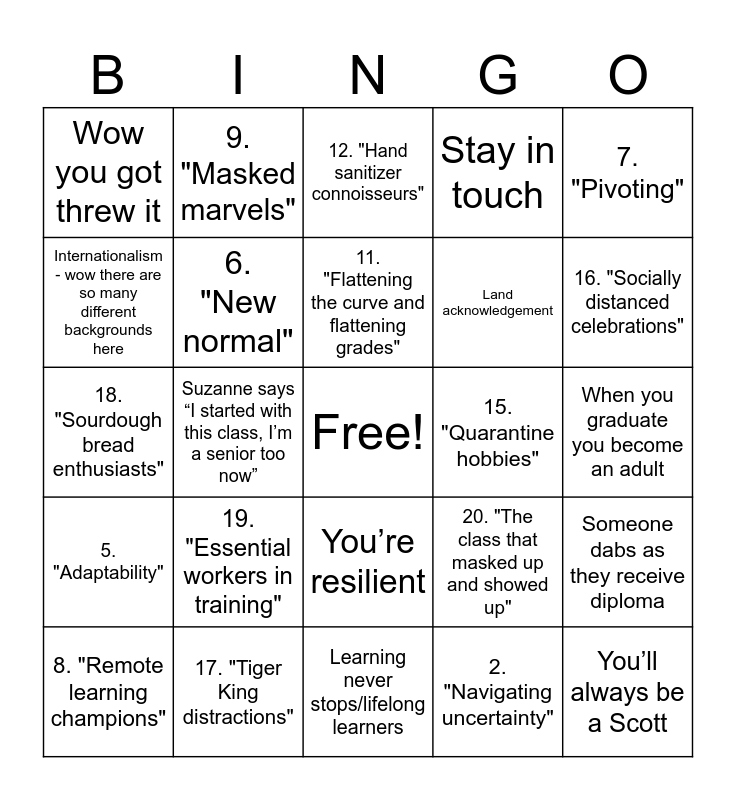 This bingo card has a free space and 34 words: "Unprecedented times", 2. "Navigating uncertainty", 3. "Zoom fatigue", 4. "Virtual hugs", 5. "Adaptability", 6. "New normal", 7. "Pivoting", 8. "Remote learning champions", 9. "Masked marvels", 10. "Six feet apart, but together in spirit", 11. "Flattening the curve and flattening grades", 12. "Hand sanitizer connoisseurs", 13. "E-learning experts", 14. "Tech-savvy graduates", 15. "Quarantine hobbies", 16. "Socially distanced celebrations", 17. "Tiger King distractions", 18. "Sourdough bread enthusiasts", 19. "Essential workers in training", 20. "The class that masked up and showed up", You’re resilient, You came in the Covid era, Wow you got threw it, When you graduate you become an adult, Learning never stops/lifelong learners, You’ll always be a Scott, Stay in touch, When you out hot eat the food, Land acknowledgement, Internationalism - wow there are so many different backgrounds here, We are the future - you’ve gotta solve climate change, Suzanne says “I started with this class, I’m a senior too now”, Someone dabs as they receive diploma and Dan does a cartwheel.