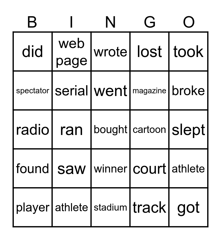 This bingo card has 25 words: saw, stadium, went, player, took, did, spectator, web page, cartoon, winner, magazine, radio, court, athlete, serial, got, slept, wrote, broke, ran, bought, athlete, found, lost and track.
