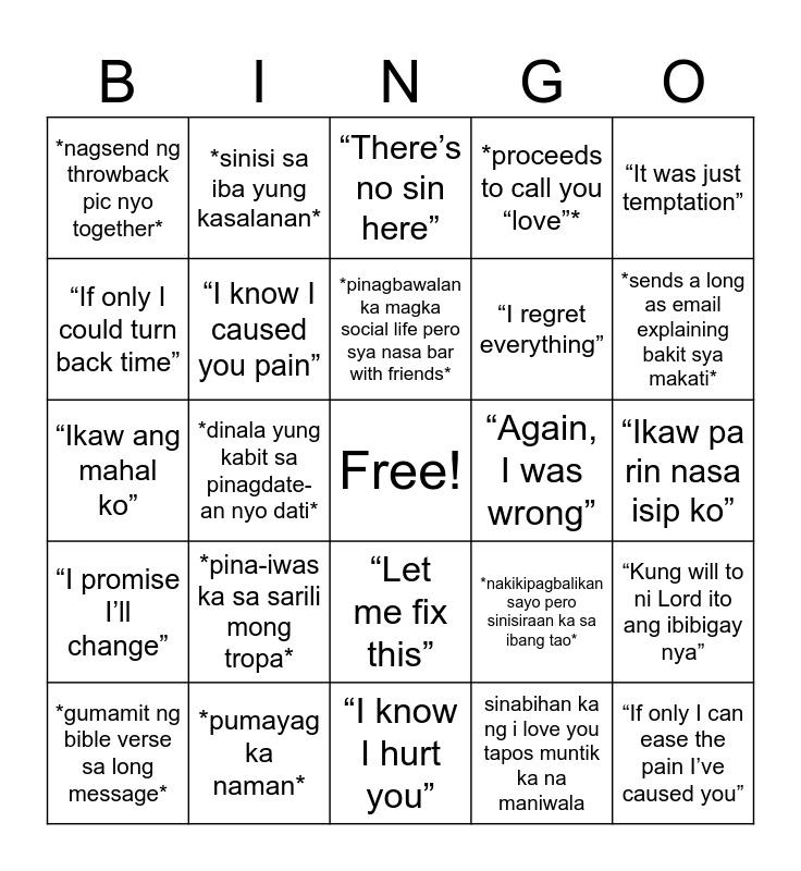 This bingo card has a free space and 24 words: *pina-iwas ka sa sarili mong tropa*, *pumayag ka naman*, *pinagbawalan ka magka social life pero sya nasa bar with friends*, *gumamit ng bible verse sa long message*, “It was just temptation”, *nagsend ng throwback pic nyo together*, “If only I could turn back time”, *sinisi sa iba yung kasalanan*, “Again, I was wrong”, “Let me fix this”, “I regret everything”, “Ikaw ang mahal ko”, *nakikipagbalikan sayo pero sinisiraan ka sa ibang tao*, “Kung will to ni Lord ito ang ibibigay nya”, “I know I caused you pain”, sinabihan ka ng i love you tapos muntik ka na maniwala, “Ikaw pa rin nasa isip ko”, “There’s no sin here”, *sends a long as email explaining bakit sya makati*, *dinala yung kabit sa pinagdate-an nyo dati*, “If only I can ease the pain I’ve caused you”, “I promise I’ll change”, *proceeds to call you “love”* and “I know I hurt you”.