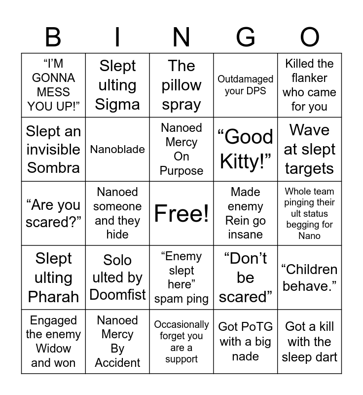 This bingo card has a free space and 24 words: Solo ulted by Doomfist, Nanoed Mercy By Accident, Nanoed Mercy On Purpose, Engaged the enemy Widow and won, Killed the flanker who came for you, “I’M GONNA MESS YOU UP!”, Slept an invisible Sombra, Slept ulting Sigma, Made enemy Rein go insane, “Enemy slept here” spam ping, “Good Kitty!”, “Are you scared?”, “Don’t be scared”, “Children behave.”, Nanoblade, Got PoTG with a big nade, Whole team pinging their ult status begging for Nano, The pillow spray, Wave at slept targets, Nanoed someone and they hide, Got a kill with the sleep dart, Slept ulting Pharah, Outdamaged your DPS and Occasionally forget you are a support.