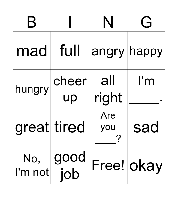 This bingo card has 17 words: Free!, No, I'm not, angry, mad, tired, happy, sad, all right, I'm ____., cheer up, good job, Are you ____?, hungry, full, great, Yes, I am and okay.