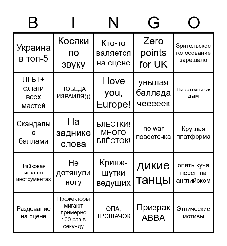 This bingo card has a free space and 24 words: Не дотянули ноту, Прожекторы мигают примерно 100 раз в секунду, I love you, Europe!, Раздевание на сцене, Зрительское голосование зарешало, Украина в топ-5, ЛГБТ+ флаги всех мастей, Косяки по звуку, no war повесточка, Кринж-шутки ведущих, унылая баллада чееееек, Скандалы с баллами, дикие танцы, опять куча песен на английском, ПОБЕДА ИЗРАИЛЯ))), Призрак ABBA, Круглая платформа, Кто-то валяется на сцене, Пиротехника/дым, На заднике слова, Этнические мотивы, Фэйковая игра на инструментах, Zero points for UK and ОПА, ТРЭШАЧОК.