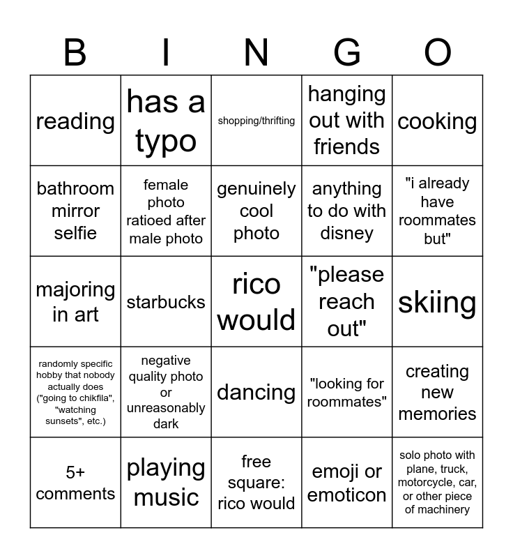 This bingo card has a free space and 70 words: snowboarding, skiing, "go outdoors", listening to music, playing music, making new friends, hanging out with friends, going to the gym/working out, cooking, concerts, creating new memories, meeting new people, reading, shopping/thrifting, hiking, starbucks, dancing, anything to do with disney, partying, randomly specific hobby that nobody actually does ("going to chikfila", "watching sunsets", etc.), "please reach out", "looking for roommates", "i already have roommates but", fully committed, 100% committed, i plan on rushing, <100% committed (or any variation), "extrovert", emoji or emoticon, specifically ":)", has a typo, multiple exclamation points in any sentence, says something obvious (i am going to unr, will be attending unr in the fall), any generic greeting as the first word, enumerates individual music artists, emoji that doesn't render on my computer, animal in photo, multiple people in photo, photo in front of non-bathroom mirror, bathroom mirror selfie, face is obscured and facing towards camera, negative quality photo or unreasonably dark, solo photo with plane, truck, motorcycle, car, or other piece of machinery, face is unreasonably close to camera, male photo ratioed after female photo, female photo ratioed after male photo, 5+ comments, unhinged comment, "View hidden comments", unhinged post, 10 images (full reel), muted and deafened (< 10 words in post), yapping (> 100 words in post), professional photo followed by all crappy photos, free square: rico would, picture can be geoguessed, genuinely cool photo, majoring in kinesiology, majoring in psychology, majoring in pre-nursing, majoring in art, majoring in business, majoring in undecided/exploratory, majoring in music, majoring in (major we haven't heard of before), came to unr for no reason (not california, not nevada), comes from cali city with population <50k, came to unr for sports, comes from washoe county high school and is named one of the top ten baby names in the united states (either female or male, even if gender doesn't match).