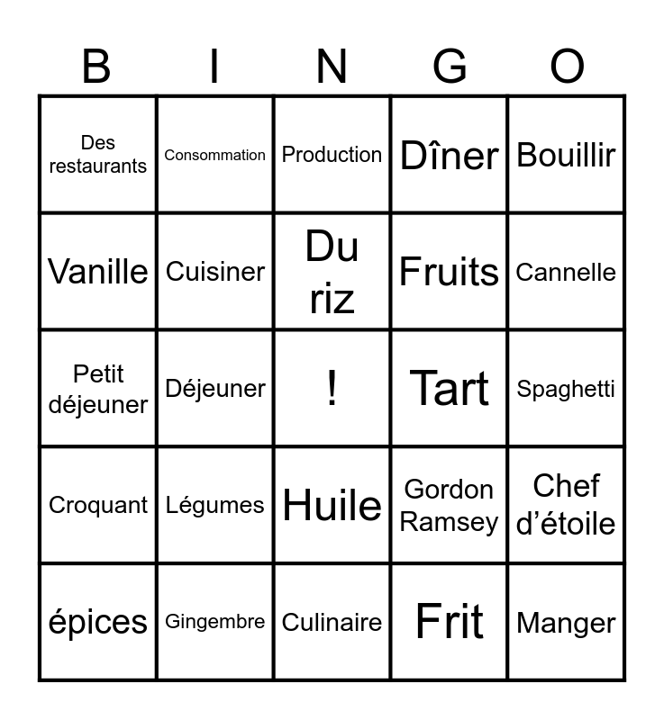 This bingo card has a free space and 24 words: Légumes, Gingembre, Du riz, épices, Bouillir, Des restaurants, Vanille, Consommation, Tart, Huile, Fruits, Petit déjeuner, Gordon Ramsey, Chef d’étoile, Cuisiner, Frit, Spaghetti, Production, Cannelle, Déjeuner, Manger, Croquant, Dîner and Culinaire.