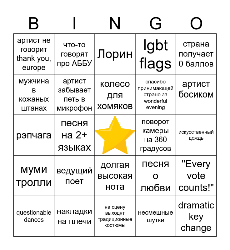 This bingo card has a free space and 43 words: Thank you, Europe!, dramatic key change, wtf моумент, questionable dances, поет на неродном языке, несмешные шутки, Лорин, gay jokes, страна получает 0 баллов, накладки на плечи, lgbt flags, поворот камеры на 360 градусов, долгая высокая нота, ведущий поет, ведущие меняют образ, на сцену выходят традиционные костюмы, чел(ы) поют мимо нот, рэпчага, в выступлении что-то идет не так, артист босиком, что-то говорят про АББУ, артист валяется на полу, smoke machine, артист не говорит thank you, europe, упоминают детское Евро, искусственный дождь, 12 баллов соседу, артист плачет, песня о любви, муми тролли, ведущие говорят что-то хором, "Every vote counts!", пайетки, пайетки и еще раз пайетки, песня на 2+ языках, неловкие задержки, акробатические трюки, Эйфелева башня на фоне, колесо для хомяков, мужчина в кожаных штанах, спасибо принимающей стране за wonderful evening, зрители с аквагримом, артист забывает петь в микрофон and политически заряженное выступление.